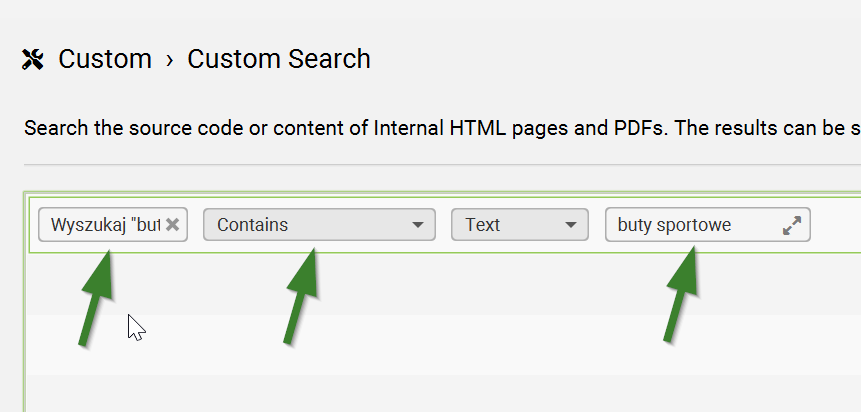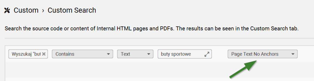 W polu Enter search query wpisz frazę lub anchor text, który chcesz zidentyfikować. Na przykład, jeśli chcesz znaleźć wszystkie wystąpienia tekstu „sportowe buty”, wpisz tę frazę w to pole. Możesz również nazwać poszczególne wyszukiwania, aby łatwiej je zidentyfikować w raporcie crawl’u (zamiast „Search 1” możesz np. wpisać frazę kluczową). Upewnij się, że jest wybrana opcja „Contains”.